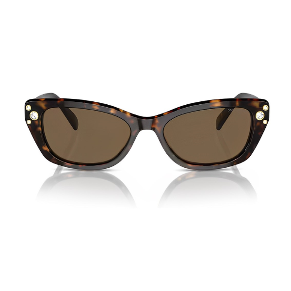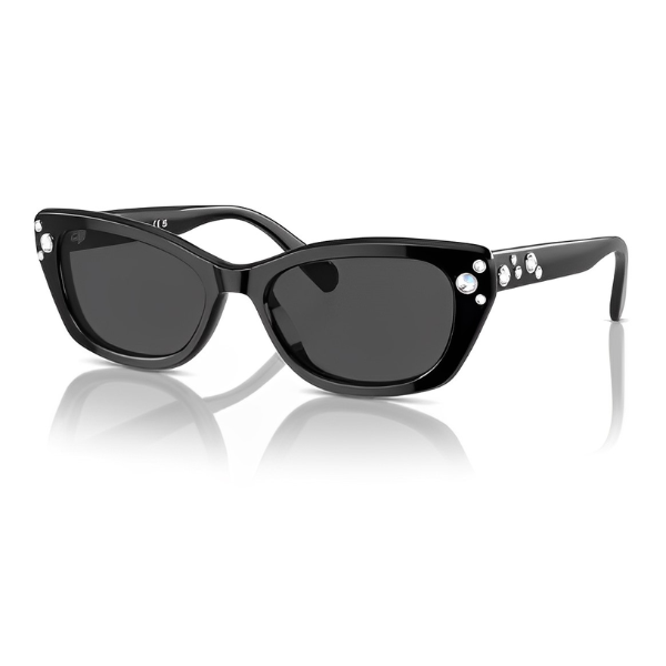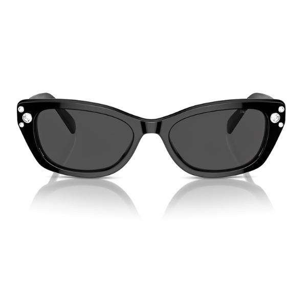 Desviando-se da colocação clássica de cristais, a Swarovski brinca com padrões neste design de sol retangular… e a brincadeira não acaba aqui. A marca também se diverte com a paleta de cores, oferecendo opções modestas e arrojadas.